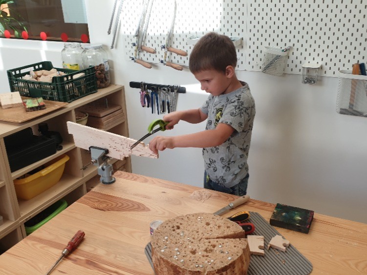 Součástí vybavení jsou koutky pro zkoumání a experimentování a také dílna, která dětem umožňuje rozvíjet pracovní a technické dovednosti. Děti zde mají možnost pracovat s různými materiály, využívají například šicí stroj či keramickou hlínu, čímž se přirozeně seznamují s tvůrčími procesy a rozvíjejí jemnou motoriku, představivost a tvořivé myšlení.